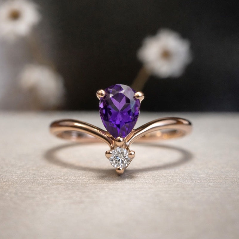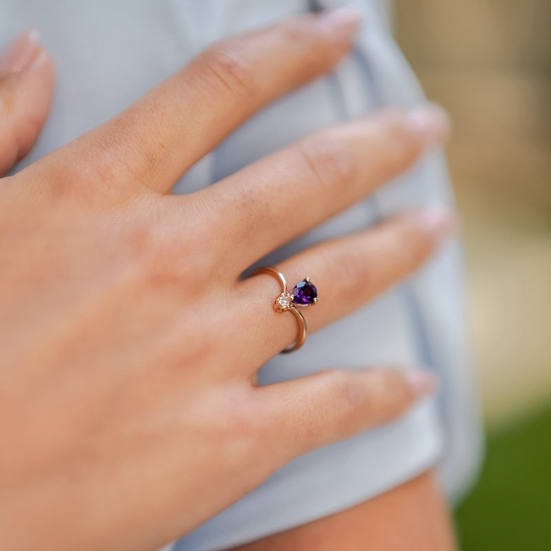 Notre bague Ginger révèle toute la profondeur d’une améthyste sélectionnée pour l’intensité de son violet et la finesse de sa taille poire.
